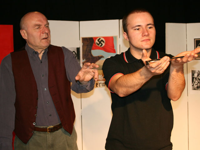 Der DolchStück von Walter Blohm Fotos: Walter Blohm Was passiert, wenn die Gesinnung des Enkels auf die reflektierte Lebenserfahrung des Großvaters stößt? Was ist, wenn der Enkel dem Großvater wegen seiner nationalsozialistischen Vergangenheit nicht glaubt? Was geschieht, wenn die Familiengeschichte schon immer rassistisch geprägt war und jetzt vom Großvater eine junge farbige Putzhilfe beschäftigt wird? Walter Blohm hat auf engem Raum einen deutschen Altnazi und Wehrmachtssoldaten in ein spannungsgeladenes Beziehungsgeflecht mit seinem neonazistischen Enkel und einer selbstbewussten schwarzen Studentin zusammengeführt. Hier flammen rassistische und sexuelle Begierden auf, die sich in Annäherung oder Gewalttätigkeiten entladen und den Versuch der Weitergabe mitmenschlicher Erfahrungen des Großvaters an die junge Generation fast überdecken. Es spielten: Aileen Simon, Andreas Wenzel, Bastian Horn Inszenierung : Walter Blohm Bühnenbild: Jürgen Heckmanns