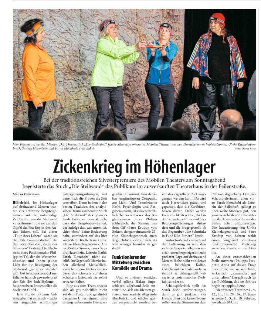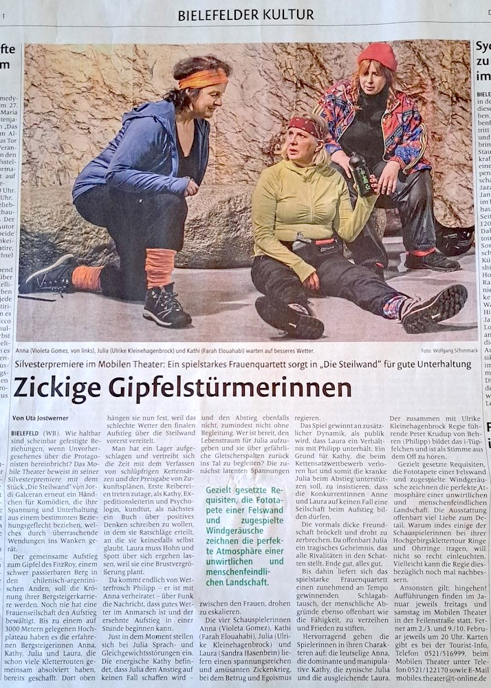 "Bei der traditionsreichen Silvesterpremiere des Mobilen Theaters am Sonntagabend begeistert das Stück 'Die Steilwand' das Publikum im ausverkauften Theaterhaus in der Feilenstraße. (...)"