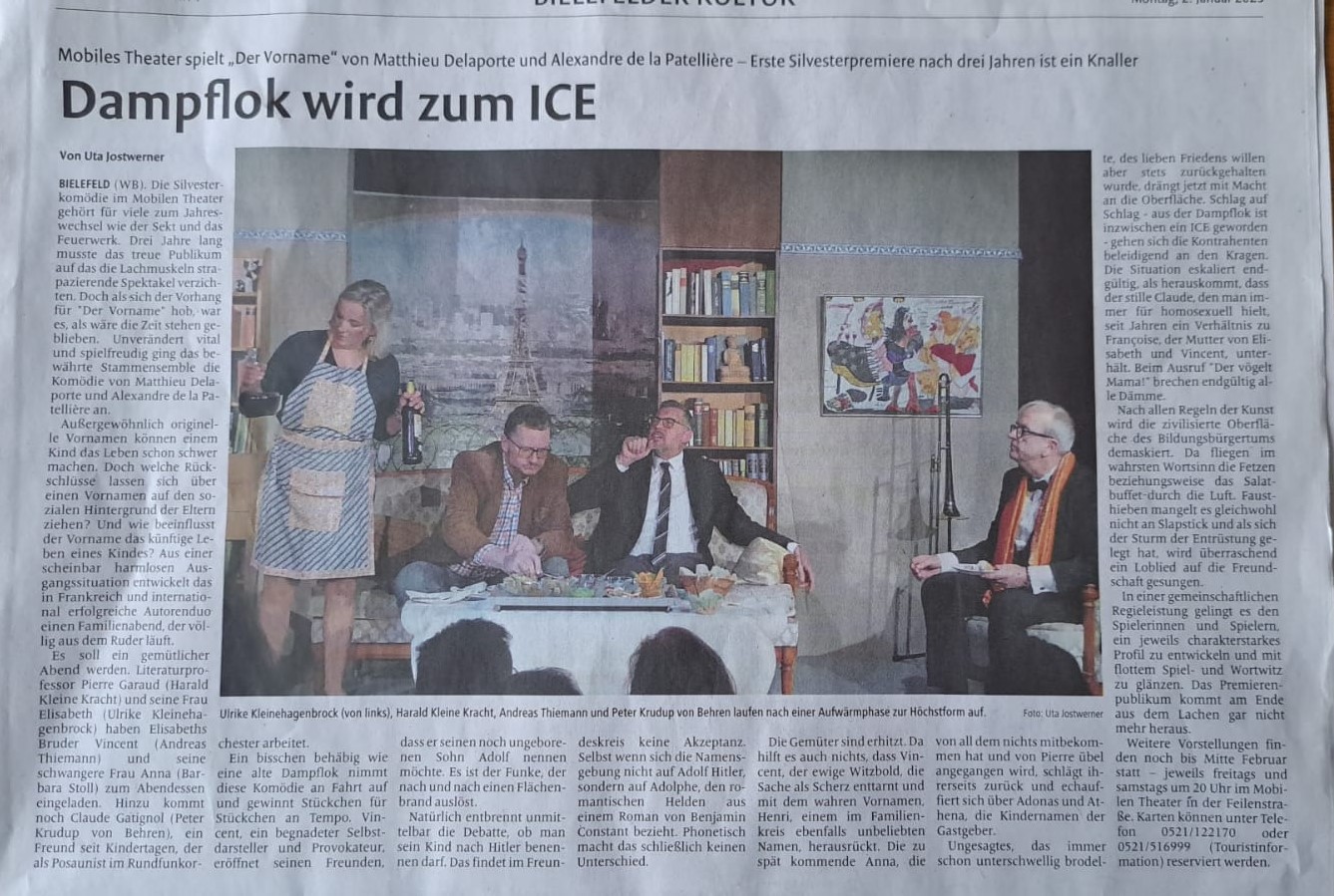 "Gut in galligen Zeiten: Galliens garstige Gesellschaftssatiren! Bühnenstücke, bei denen aus gemütlichen Zusammenkünften im engsten Freundes- und Familienkreis im Champagnerglasumdrehen ein genüssliches Hauen und Stechen wird. Bis ganz am Ende sich alle Wangenküsschen geben und wieder Friede, Freude, Crepe Suzette herrscht. Zumindest in dem 2010 in Paris uraufgeführten Stück 'Der Vorname' von Alexandre de La Patelliere und Matthieu Delaporte, das im Bielefelder Mobilen Theater am Silvesterabend vor ausverkauftem Haus Premiere feierte.(...)"