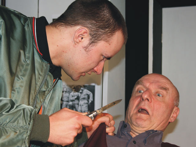 Der DolchStück von Walter Blohm Fotos: Walter Blohm Was passiert, wenn die Gesinnung des Enkels auf die reflektierte Lebenserfahrung des Großvaters stößt? Was ist, wenn der Enkel dem Großvater wegen seiner nationalsozialistischen Vergangenheit nicht glaubt? Was geschieht, wenn die Familiengeschichte schon immer rassistisch geprägt war und jetzt vom Großvater eine junge farbige Putzhilfe beschäftigt wird? Walter Blohm hat auf engem Raum einen deutschen Altnazi und Wehrmachtssoldaten in ein spannungsgeladenes Beziehungsgeflecht mit seinem neonazistischen Enkel und einer selbstbewussten schwarzen Studentin zusammengeführt. Hier flammen rassistische und sexuelle Begierden auf, die sich in Annäherung oder Gewalttätigkeiten entladen und den Versuch der Weitergabe mitmenschlicher Erfahrungen des Großvaters an die junge Generation fast überdecken. Es spielten: Aileen Simon, Andreas Wenzel, Bastian Horn Inszenierung : Walter Blohm Bühnenbild: Jürgen Heckmanns