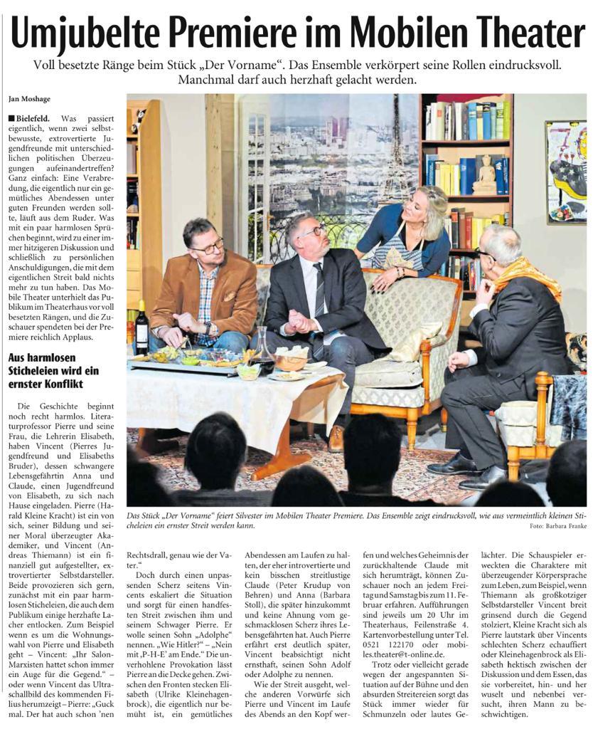 "Gut in galligen Zeiten: Galliens garstige Gesellschaftssatiren! Bühnenstücke, bei denen aus gemütlichen Zusammenkünften im engsten Freundes- und Familienkreis im Champagnerglasumdrehen ein genüssliches Hauen und Stechen wird. Bis ganz am Ende sich alle Wangenküsschen geben und wieder Friede, Freude, Crepe Suzette herrscht. Zumindest in dem 2010 in Paris uraufgeführten Stück 'Der Vorname' von Alexandre de La Patelliere und Matthieu Delaporte, das im Bielefelder Mobilen Theater am Silvesterabend vor ausverkauftem Haus Premiere feierte.(...)"