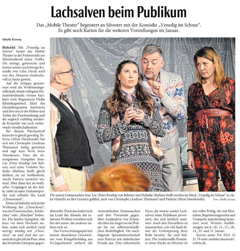 "Das 'Mobile Theater' begeistert an Silvester mit der Komödie 'Venedig im Schnee'. Es gibt noch Karten für die weiteren Vorstellungen im Januar (...)"
