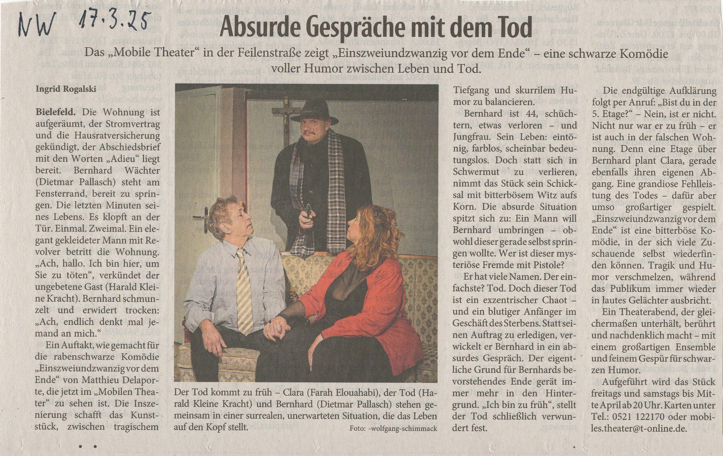 "Das 'Mobile Theater' in der Feilenstraße zeigt 'Einszweiundzwanzig vor dem Ende' - eine schwarze Komödie voller Humor zwischen Leben und Tod. (...)"